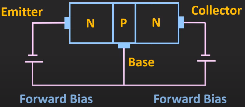 - current flows from emitter to collector (reverse biased) (note that in the diagram in the Active Region section, current flows from base to collector because it’s a common base config)
